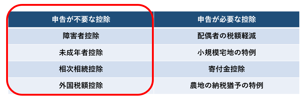 申告義務のない「控除」4つあり、表の左側のものとなります。適用要件に当てはまれば誰でも使えるものになりますので、確認していきましょう。