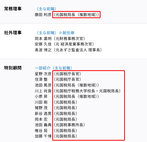 当法人には、元国税庁長官・国税局長をはじめとする税務署OBが多数在籍しており、その在籍数は業界最大規模を誇ります。