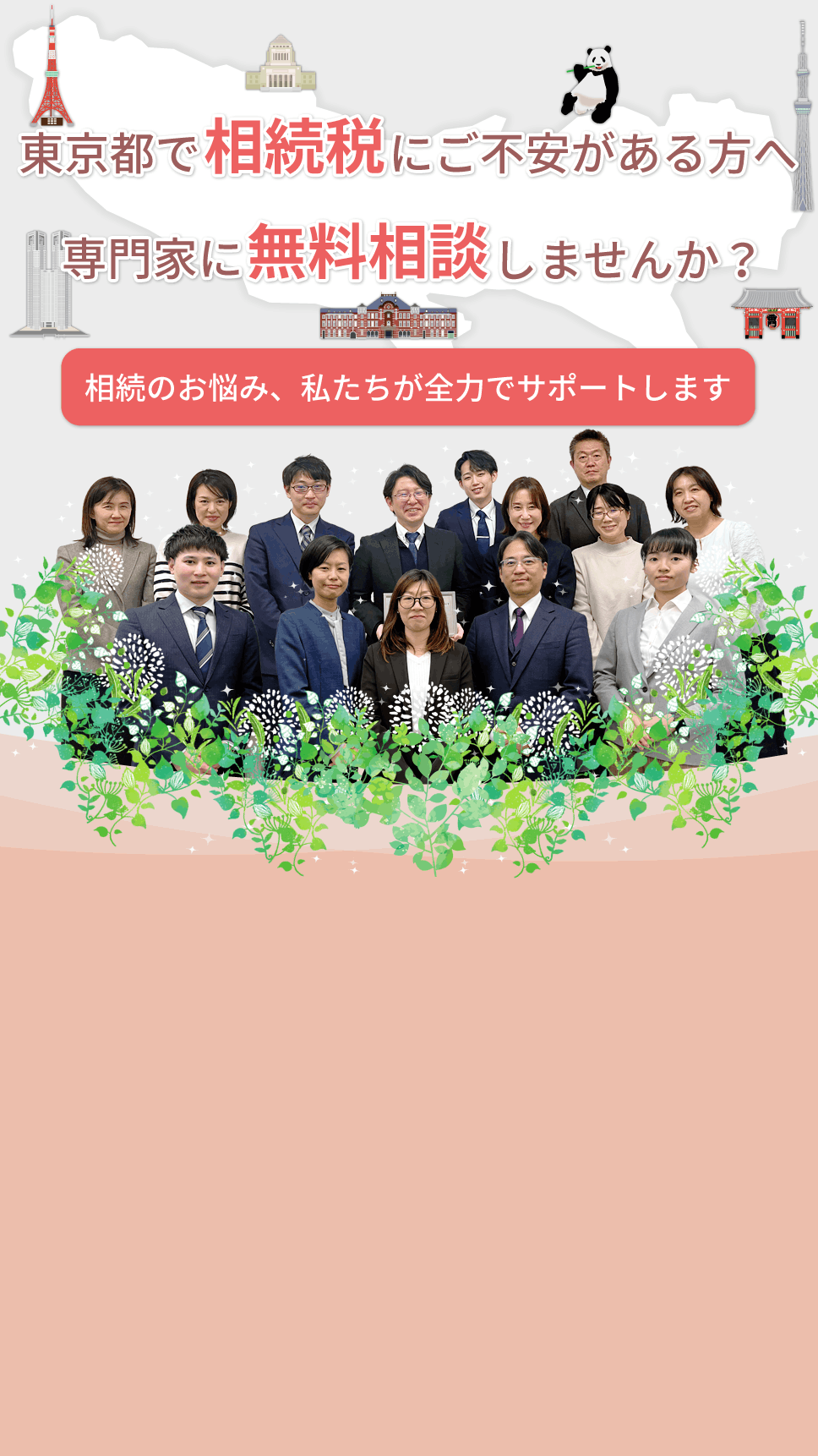 当事務所には、相続税申告に特化したチームメンバーが在籍しております。年間100件を超える豊富実績に基づき、複雑な土地評価から遺産分割のアドバイスまで、質の高いサービスをご提供いたします。