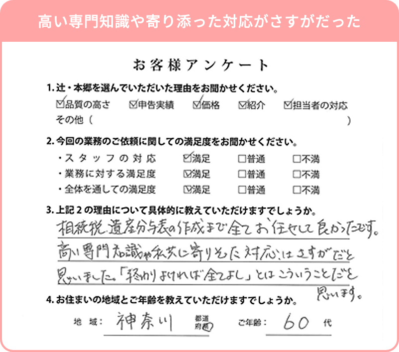 相続は、ご家族ごとに異なる「一生に一度」の大切な節目です。一つとして同じケースはございません。 私たちは、お客様お一人おひとりが抱える不安や疑問を丁寧に解消し、「相談して本当によかった」と心からご安心いただけるよう、申告完了までプロの伴走者として誠心誠意サポートさせていただきます。