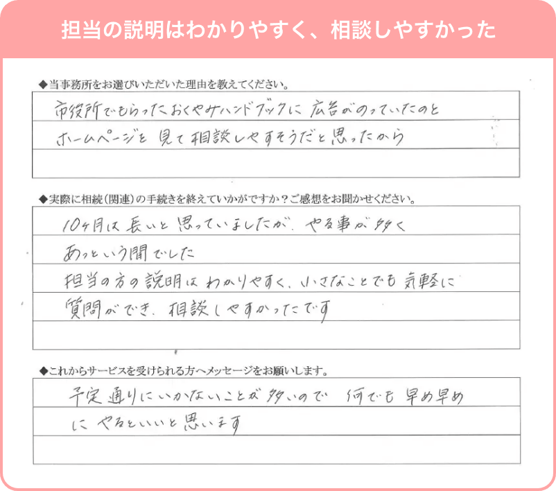 相続の手続きは、一生に何度も経験することではありません。専門用語ばかりで難しそう、親族間でどう話し合えばいいのか分からない……。そんな不安を抱えていらっしゃるお客様をしっかりとサポートしてまいります。