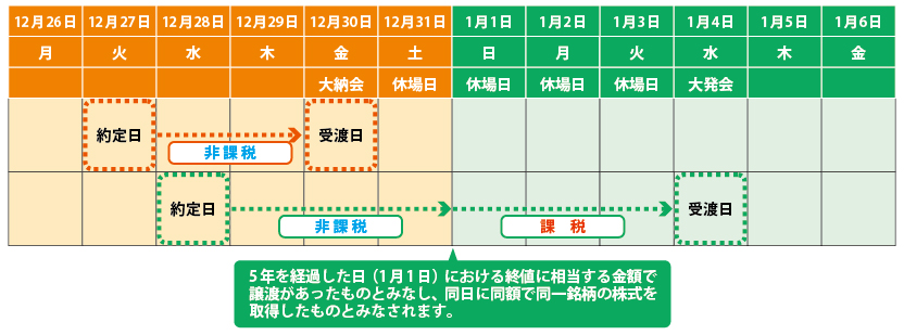 図1の例の場合、年内の非課税投資枠を利用するためには12月27日までに株式を購入しなければなりません。12月28日以降に購入した株式は受渡日が翌年になってしまうため、翌年の非課税投資枠を使うことになります。