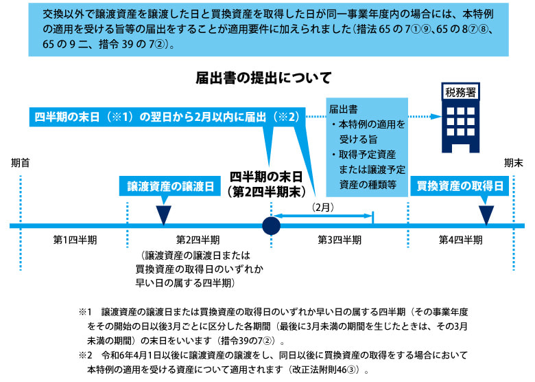 さらに、改正により令和6(2024)年4月1日以降の買換えについては、譲渡資産の譲渡日(買換資産を先に取得する場合は、買換資産の取得日)の属する四半期(注1)の末日の翌日から2月以内に下記事項を記載した届出書の提出が手続に加えられました。
